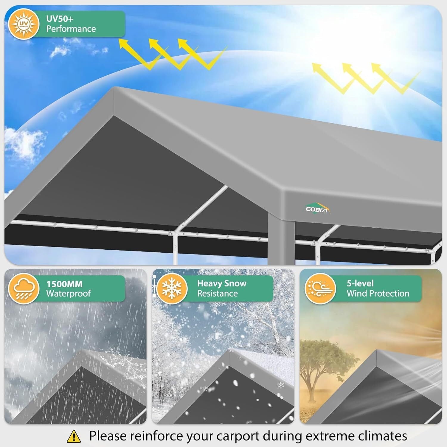 The tarp of our 10x20 carport, crafted from 160gPE material, offers excellent waterproof, ultraviolet-resistant, and tear-resistant properties. It is designed to provide year-round protection for your vehicles.