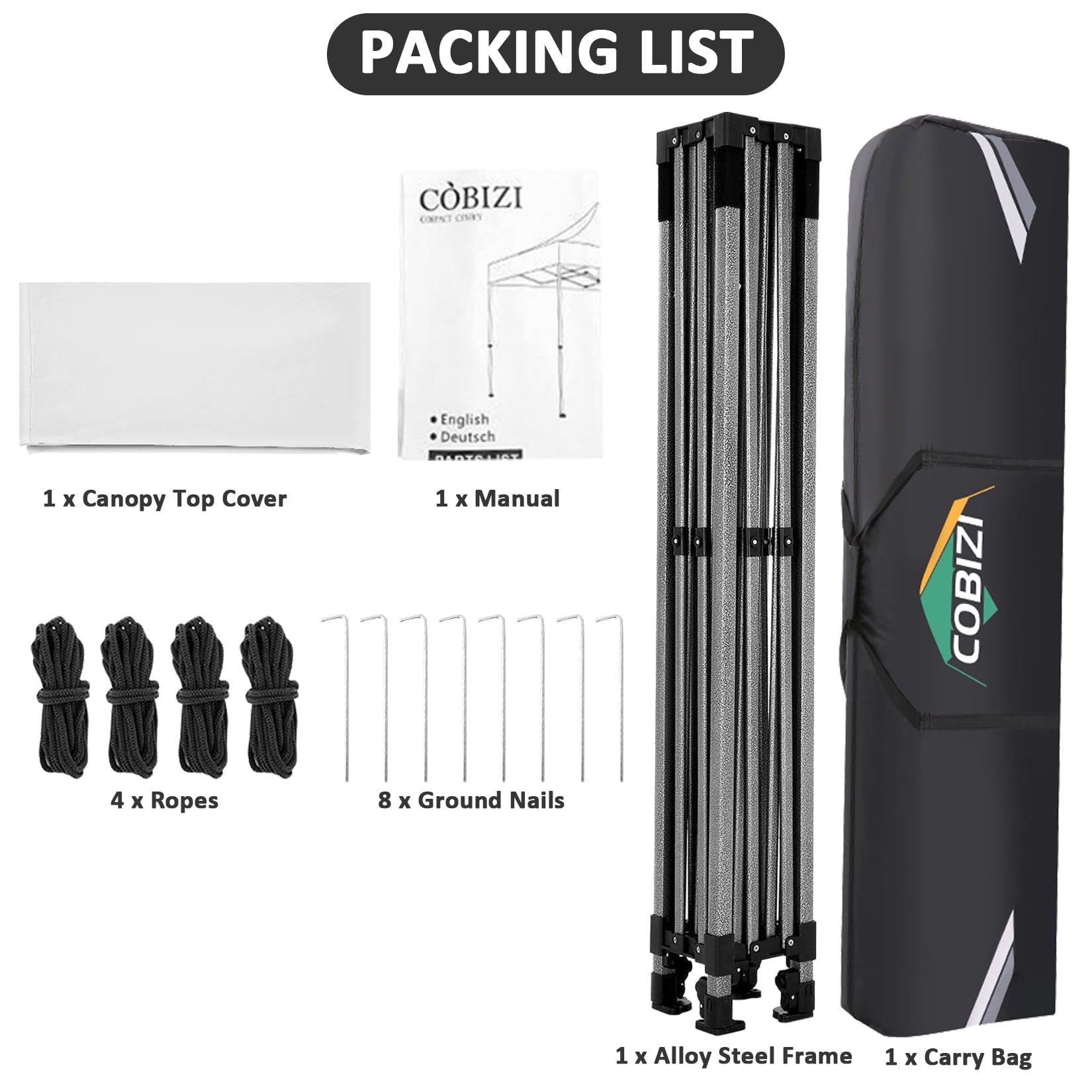 - 10x10 Pop up canopy Top Cover x 1, Pop Up Canopy Frame x 1, Sandbag x 4, Ground Nails x 8, Ropes x 4, Wheeled Storage Bag x 1. We have a professional service team and provide 24/11 customer service to help you with any questions or queries you may have while using COBIZI products.