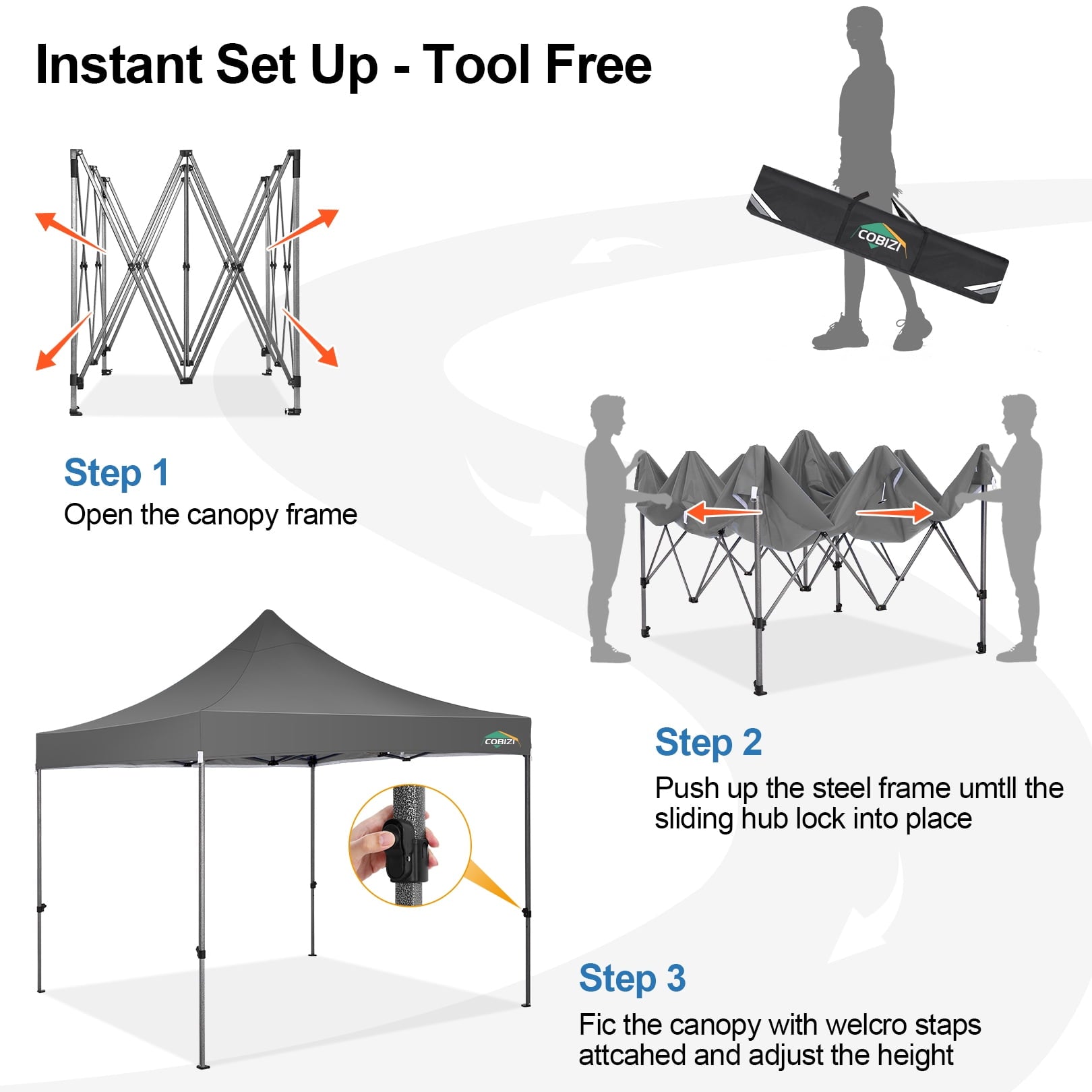 - Ez setup canopy outdoor gazebo for outside 10x10 have 3 height settings . You can quickly and easily adjust three height positions by simply pulling the button outward: 214cm/84.3in, 223cm/87.8in, 232cm/91.7in, no tools required. COBIZI easy pop up canopy tent have upgraded buttons, which are easy to lock and release, adjust to avoid clamping your hand and be safer.