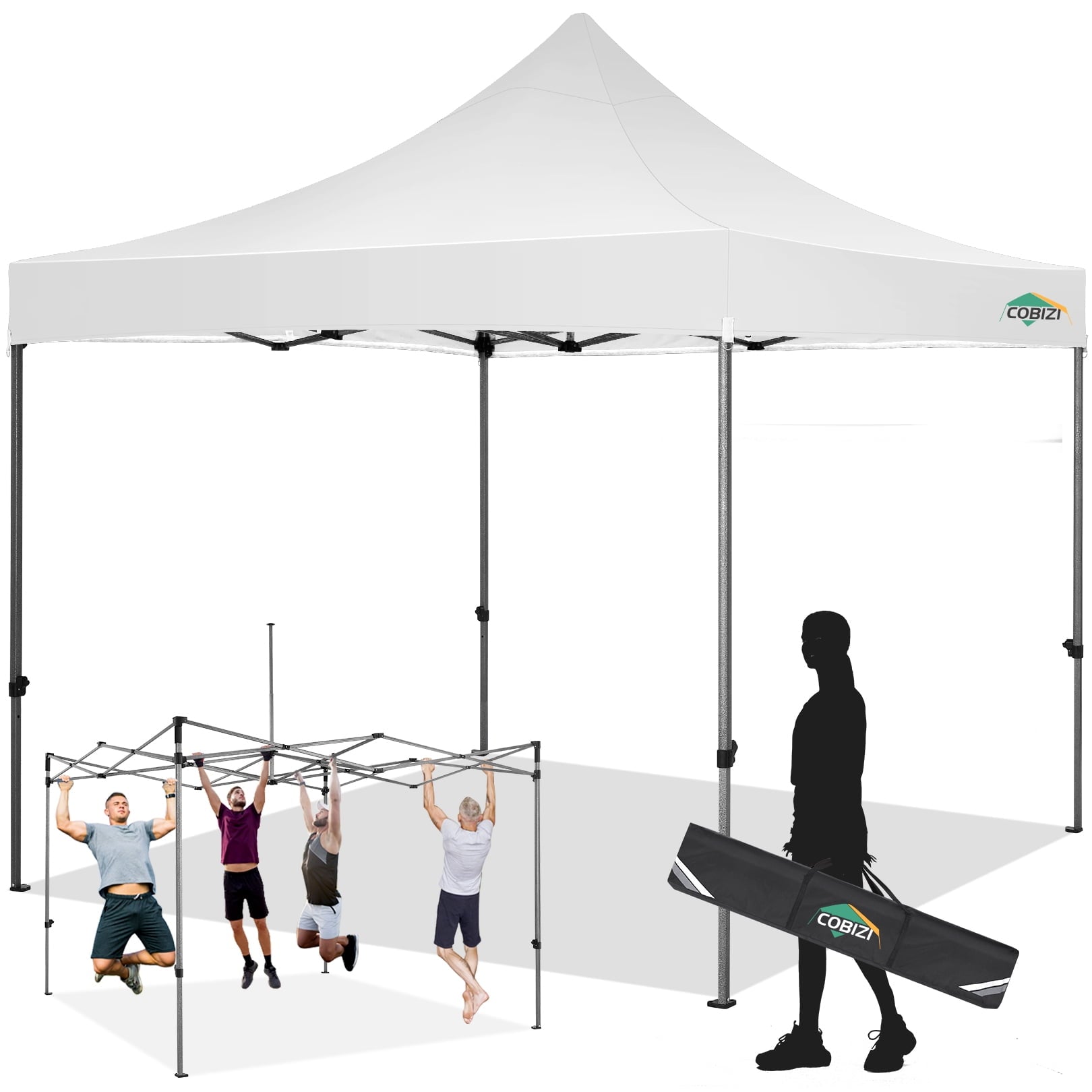 The COBIZI 10' x 10' Pop-up Canopy Tent for for outside is Crafted with a heavy-duty frame, this heavy duty canopy for outside can hold up to 500kg(1100lb) and withstand level 4 winds. The pop-up canopy instant shelter is made of 300D PU Oxford fabric, offering UPF 50+ and 100% waterproof. This10'x10' instant canopy tent features 3 adjustable height settings for versatile use. Setting up is easy with no tools required, and it comes with a handbag for easy transport .