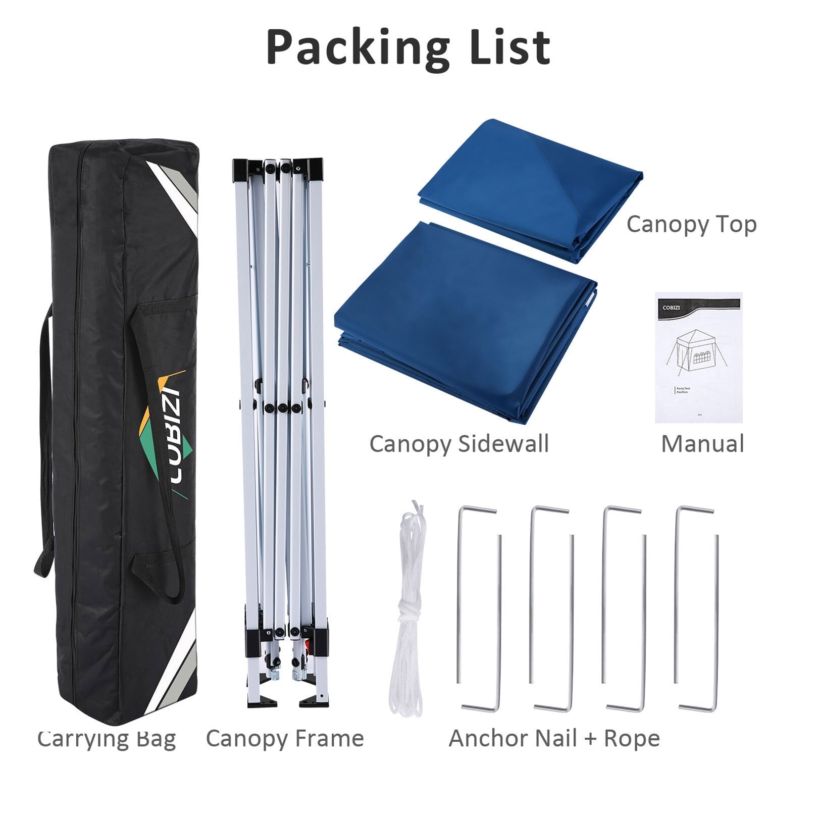 ?1x foldable canopy frame; 1x top cover; 4x side walls - 2 side walls with windows, 2 door walls with zipper; 1x 600D carry bag that fits in your trunk. 8x pegs and 4x ropes provide extra security to tie down the tents and keep out wind.