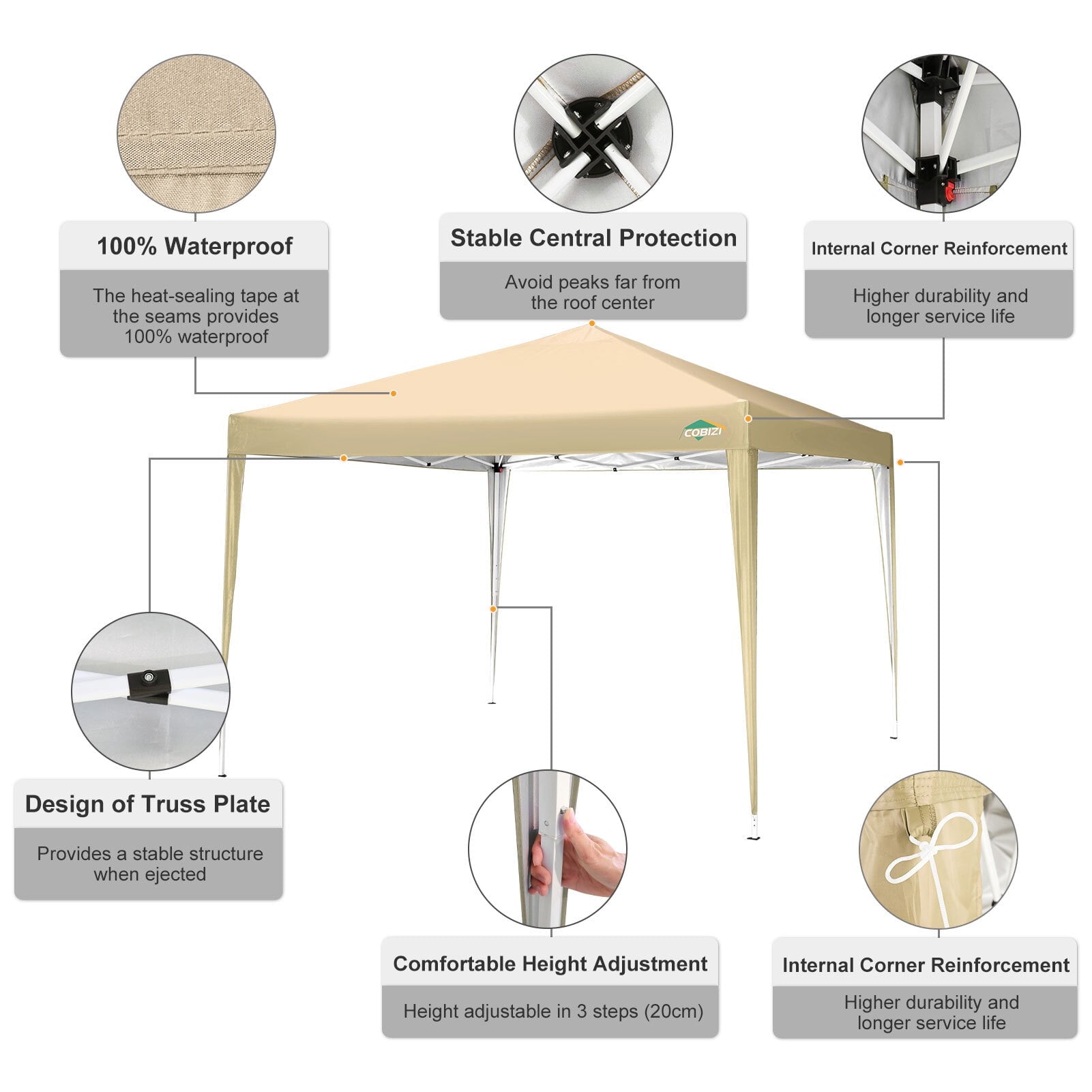 - No tools required.The COBIZ1 10x10 ez pop up canopy is designed for convenience. All the parts are already assembled, so you don't have to worry about missing pieces or searching for tools. Whether you're setting up for a party or taking it down after an event, our tent makes the process quick and effortless.