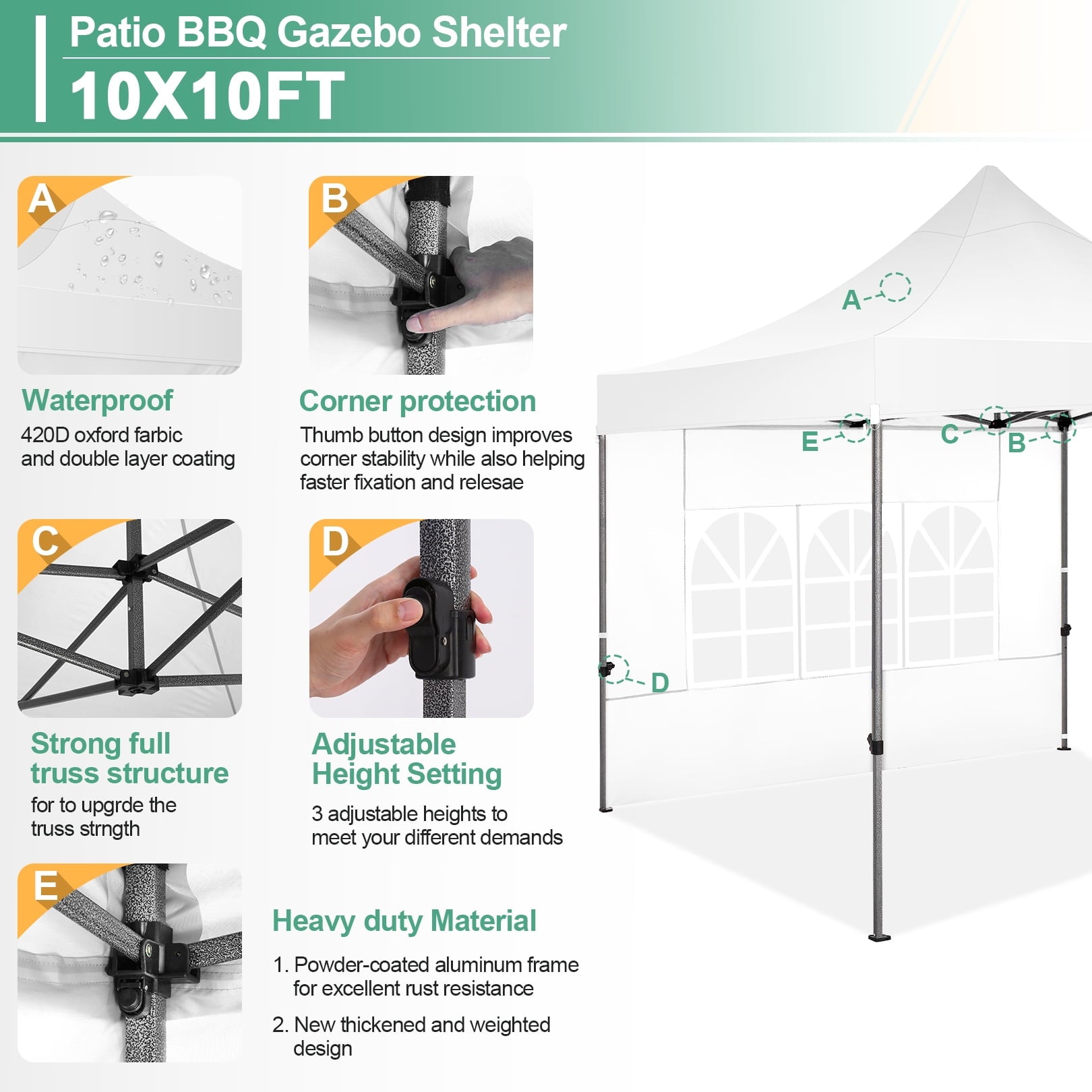 10x10 pop up party tent straight leg has 3 height settings. Thumb latch lock system easy to lock and release, raise the pop up tent to a desired height. Canopy tent 10x10 straight leg height options: 214cm/84.3inch, 223cm/87.8inch, 232cm/91.3inch. Corresponding party tent center height options: 310cm/122.0inch, 319cm/125.6inch, 328cm/129.1inch. 10x10 canopy with sidewalls perfect for commercial activities, camping, festivals, tailgating, backyard events and etc..
