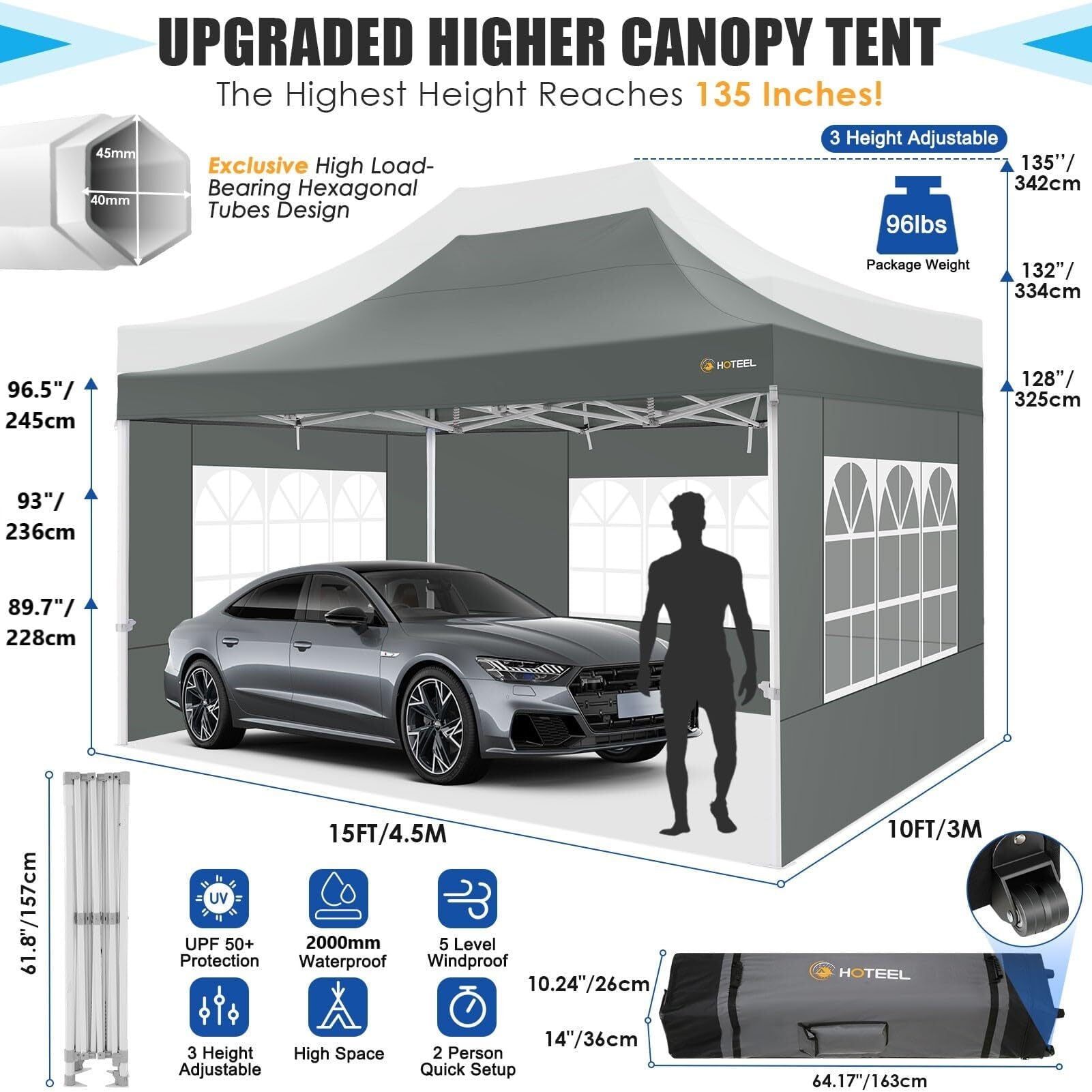 Our COBIZI 10x15 heavy-duty pop-up canopy comes with 4 PU coated sidewalls and a frame made of upgraded thickened hexagonal pipes with a diameter of 1.77 inches and a thickness of 0.03 inches.