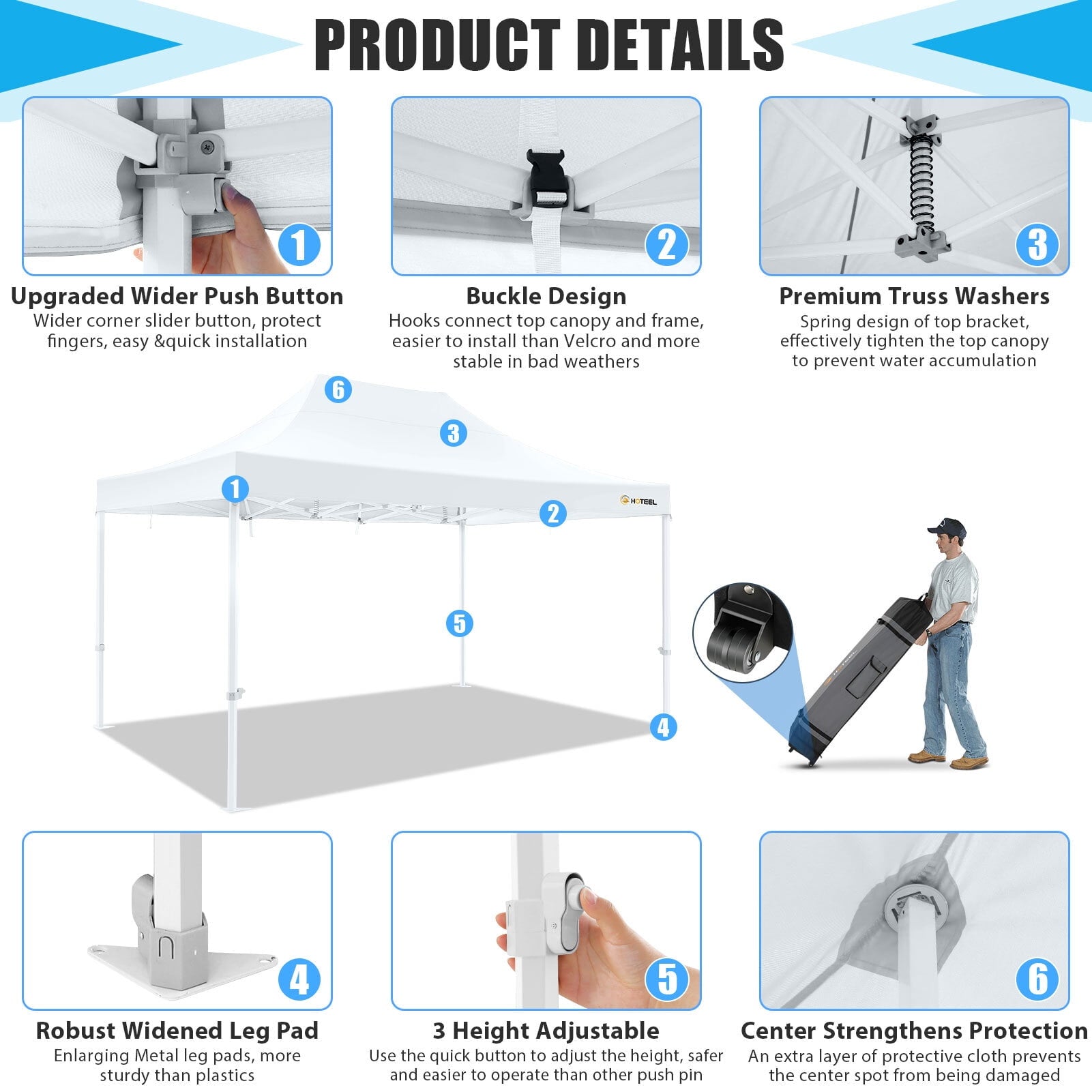 COBIZI 10x15 canopy with sidewalls frame is made of upgraded heavy duty bracket. The 4 solid legs are consists of 45*35*0.7mm unique hexagonal poles, plus with 15*30*0.6mm thickened cross tube bracket, both provide enough sturdiness and stability for this 10x15 pop up canopy. This strong structure can even withstand 10.7 m/s winds while other canopy only withstand 5 m/s winds.
