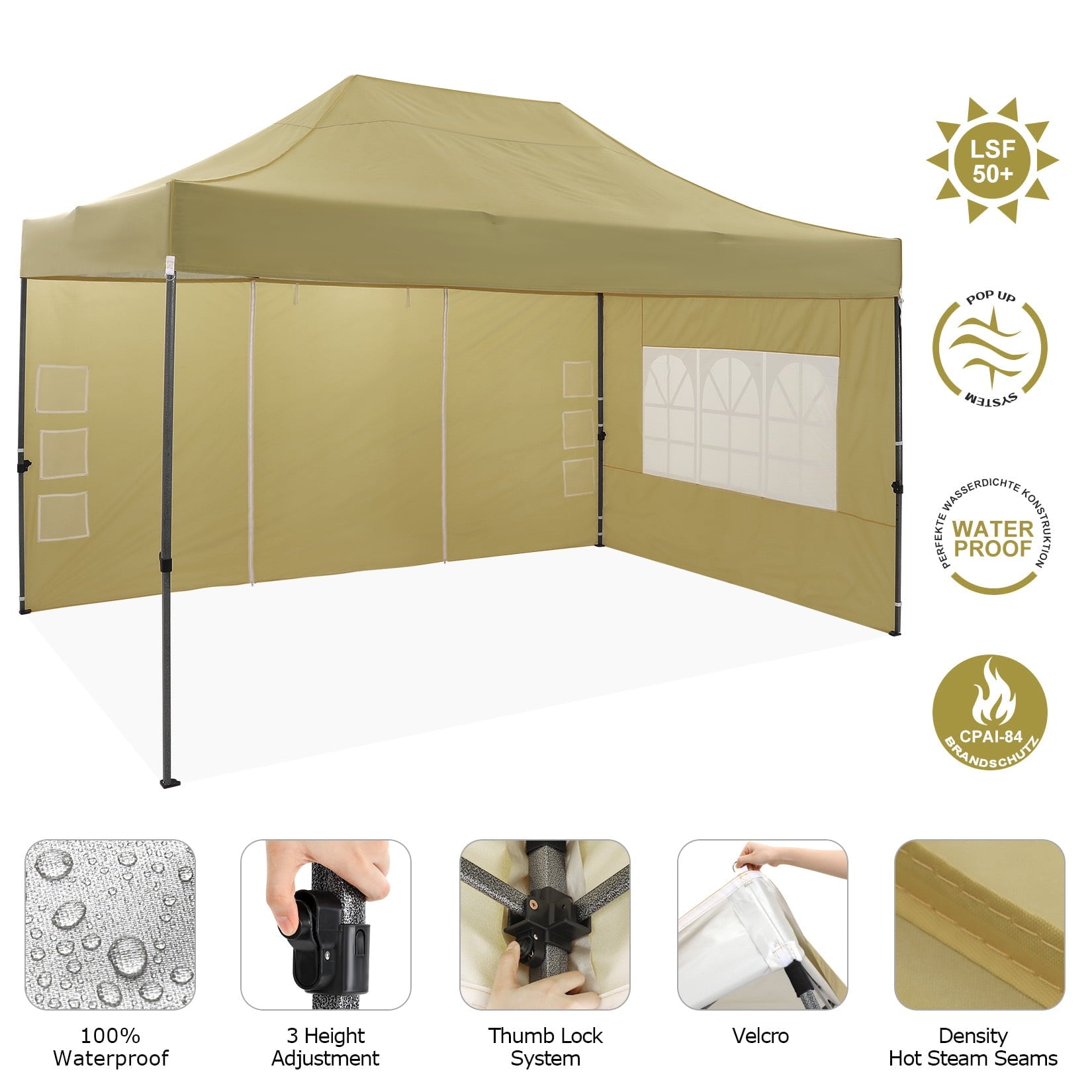 ??: Equipped with practical snap buttons, the 10x15 Pop Up Canopy can be assembled or disassembled by 2-4 people within minutes, without the need for tools. Choose from 3 height settings (222cm - 232cm - 240cm) to find the perfect height. The upgraded thumb latch system is easy to lock and release, ensuring finger protection against pinching.