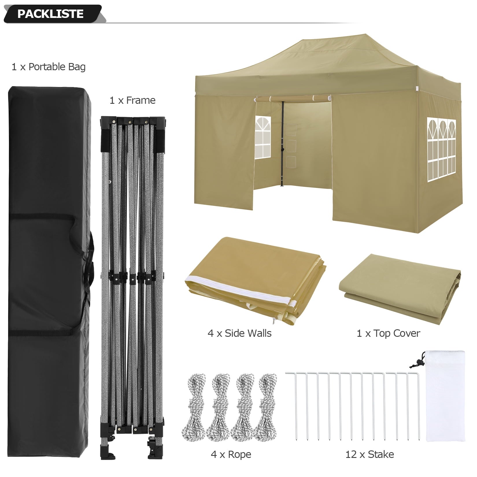 ?? : With 4 x removable sidewalls, 4 x ropes, and 12 x tent stakes,serves various purposes. Covering an area of 13.5 m2, it comfortably accommodates up to 20 standing individuals or 15 seated. It's an ideal solution for fairs, markets, parties, festivals, and any outdoor event.