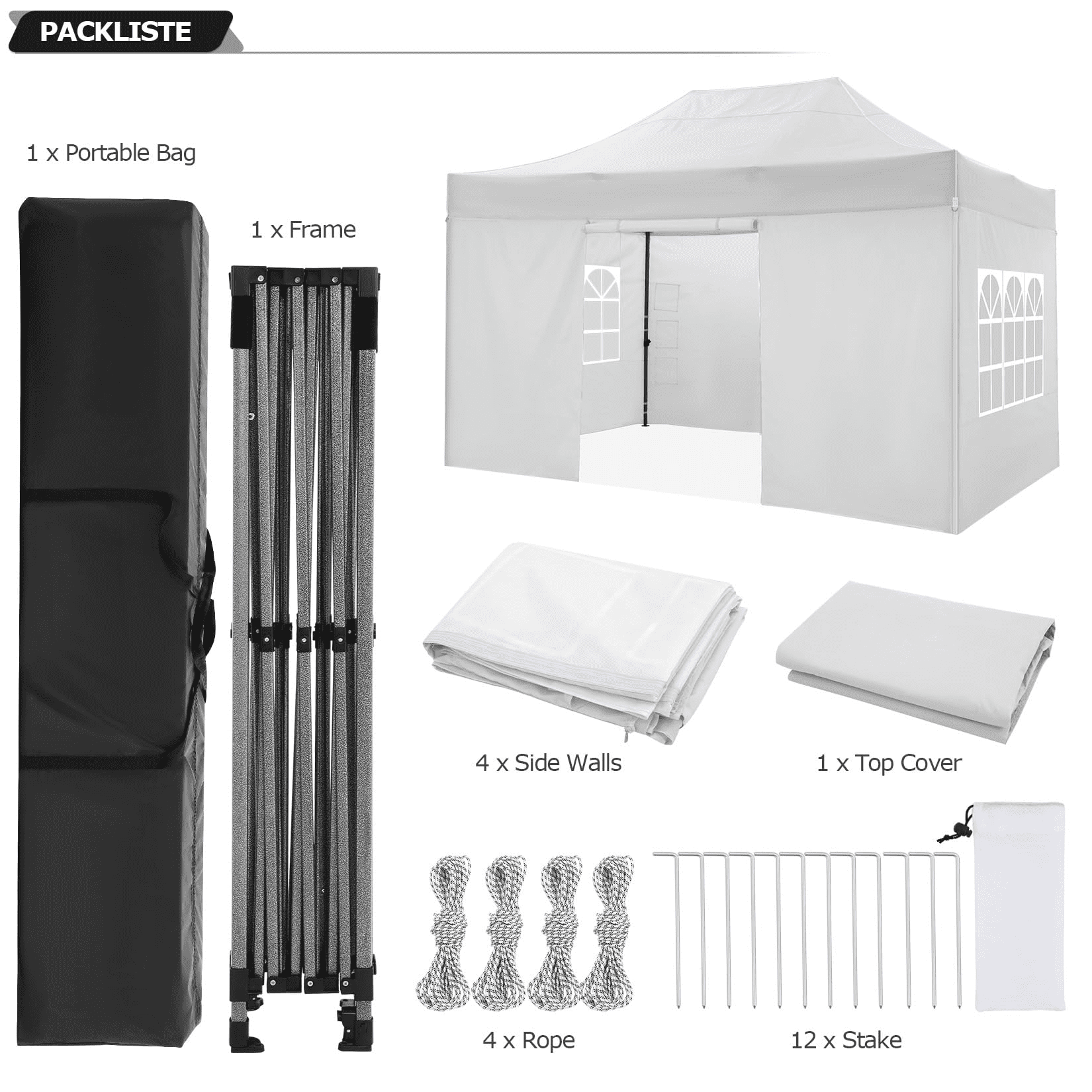 ?? : With 4 x removable sidewalls, 4 x ropes, and 12 x tent stakes,serves various purposes. Covering an area of 13.5 m2, it comfortably accommodates up to 20 standing individuals or 15 seated. It's an ideal solution for fairs, markets, parties, festivals, and any outdoor event.