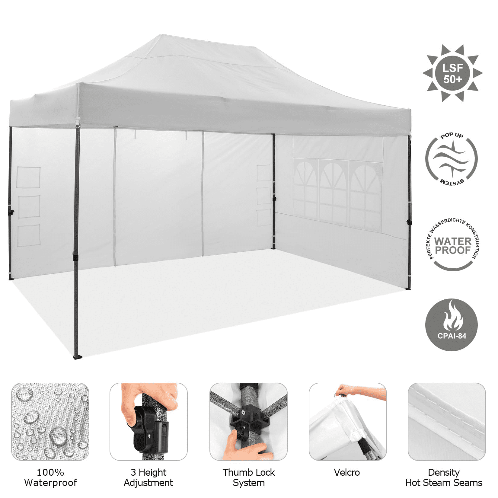 ??: Equipped with practical snap buttons, the 10x15 Pop Up Canopy can be assembled or disassembled by 2-4 people within minutes, without the need for tools. Choose from 3 height settings (222cm - 232cm - 240cm) to find the perfect height. The upgraded thumb latch system is easy to lock and release, ensuring finger protection against pinching.