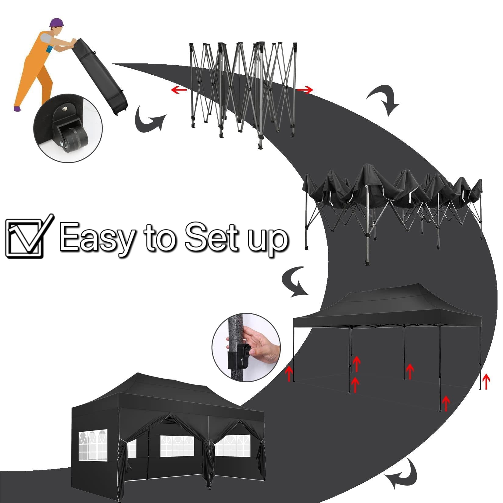 - Quick and Easy Setup, 3 Heights: 10 x 20 Pop up tent can be quickly installed and dismantled by 2-3 people in minutes without tools, easily accommodates 15-20 people. You can adjust heavy duty canopy in 3 different heights (86", 90", 94") according to your needs with thumb button