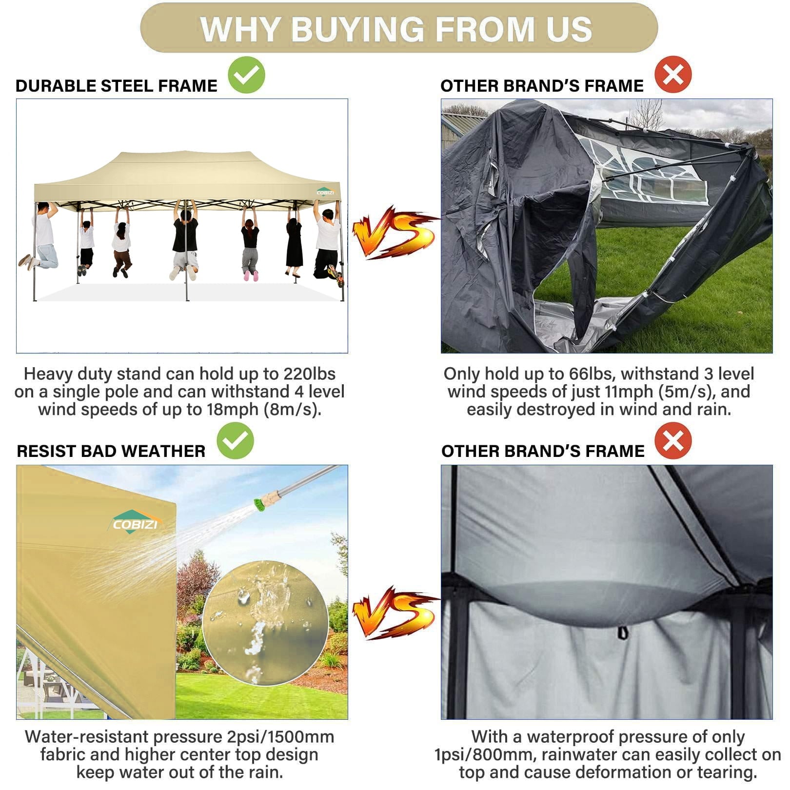 COBIZI 10x20 Heavy Duty Pop up Canopy Tent with 6 sidewalls Easy Up Commercial Outdoor Canopy Wedding Party Tent for Beach All Season Wind & Waterproof Gazebo with Roller Bag,Khaki (Frame Thickened)