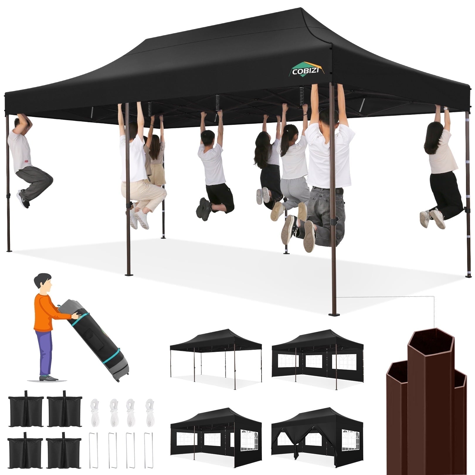 COBIZI 10x20 Pop Up Canopy Tent Heavy Duty with 6 Removable Sidewalls,Commercial Pop Up Tent for Parties All Weather Waterproof Wedding Tent with Roller Bag(Black)