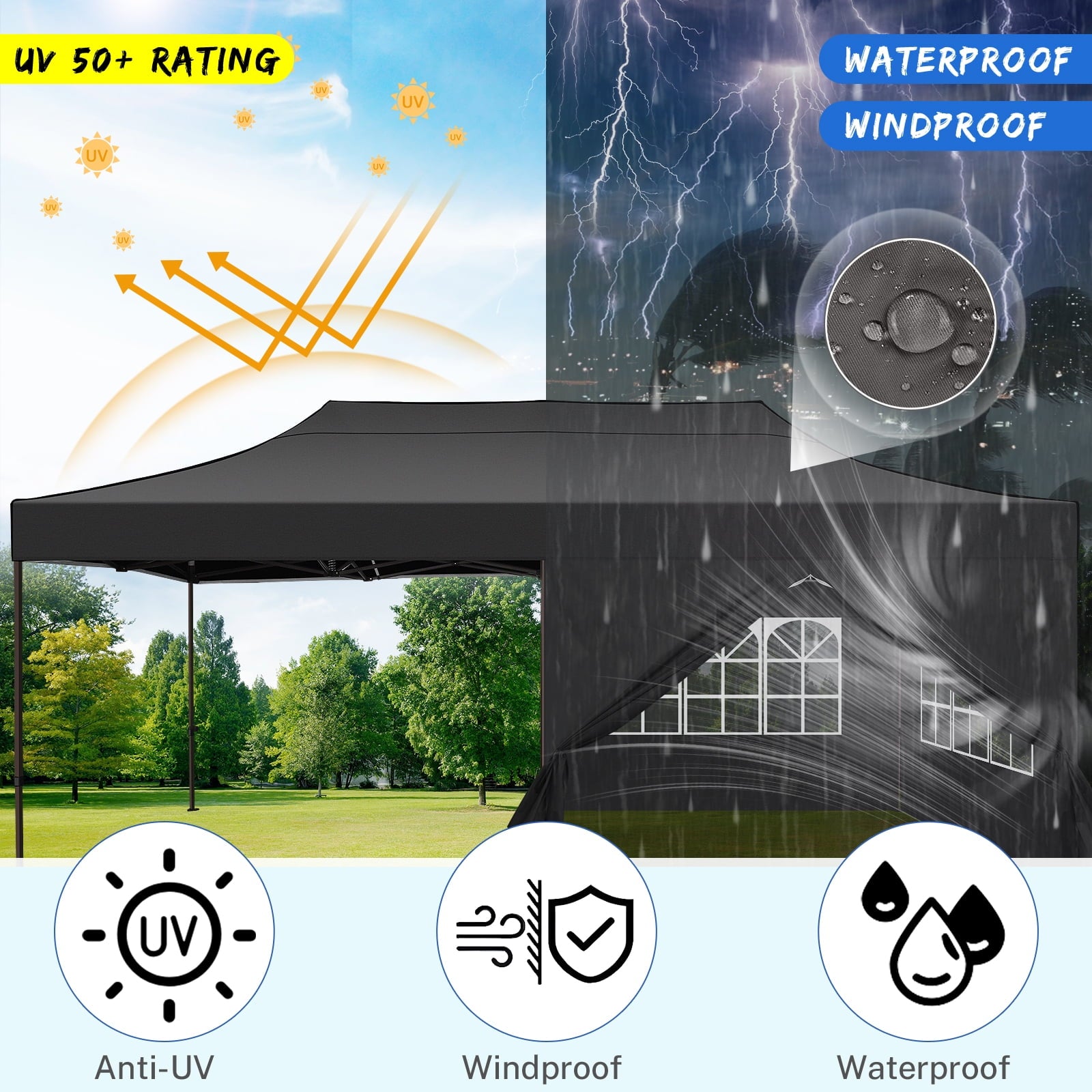 10 x 20 pop up canopy tent is made of 260g waterproof oxford fabric. The top fabric is coated with two layers of PVC with heat-sealed seams waterproof strip technology, 100% waterproof and blocks 99% UV rays.