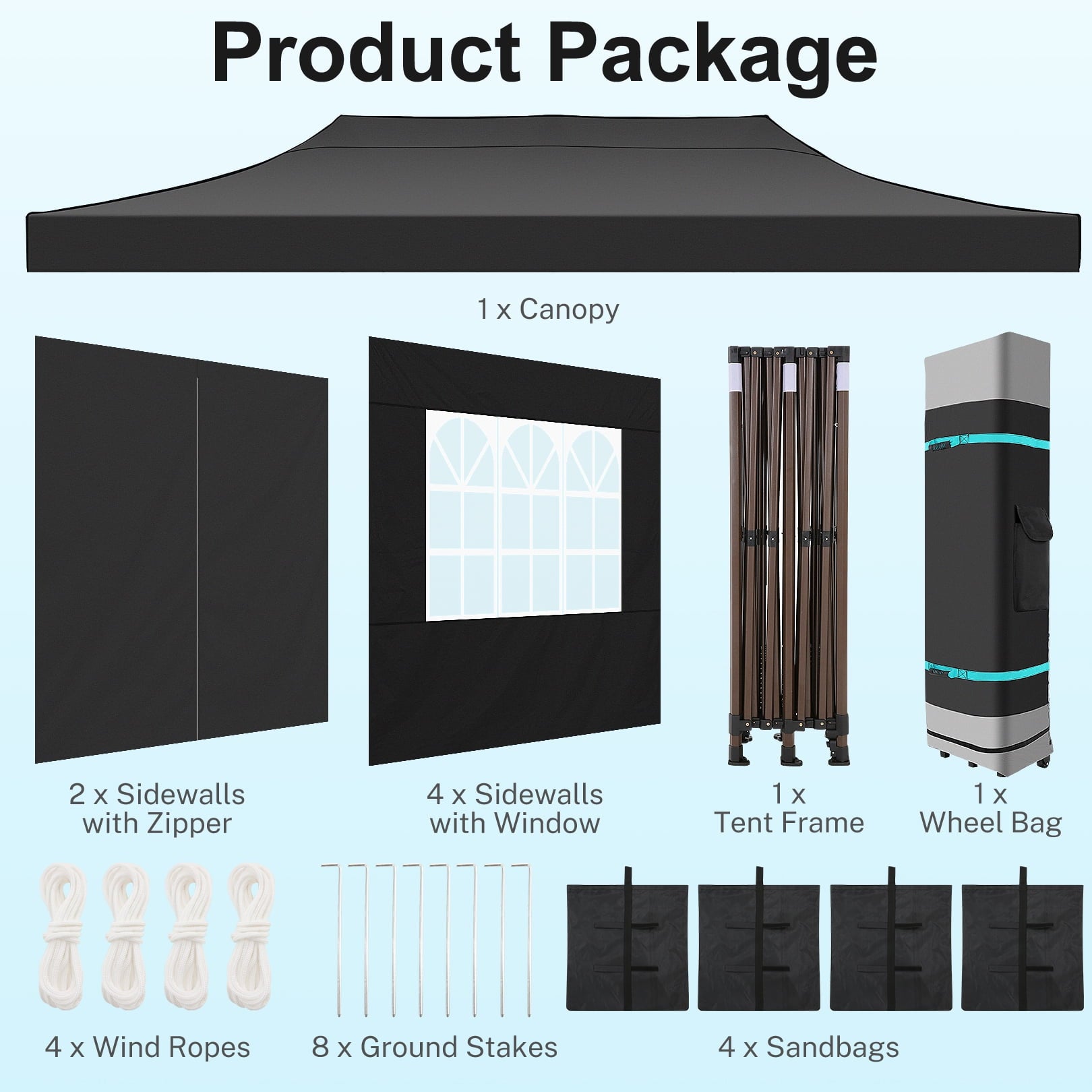 1x Commercial Grade 10x20 Pop Up Tent Frame, 1x Top Cover, 6x PU Coated Panels (4 x Sidewalls with Windows and 2x Sidewalls with Zippers), 4x 420D Oxford Fabric PVC Coated Sandbags, 8 x Ground Pegs, 4x Windproof Ropes, 1x Rolling Bags, 1x Manual. We provide 1 year warranty service.