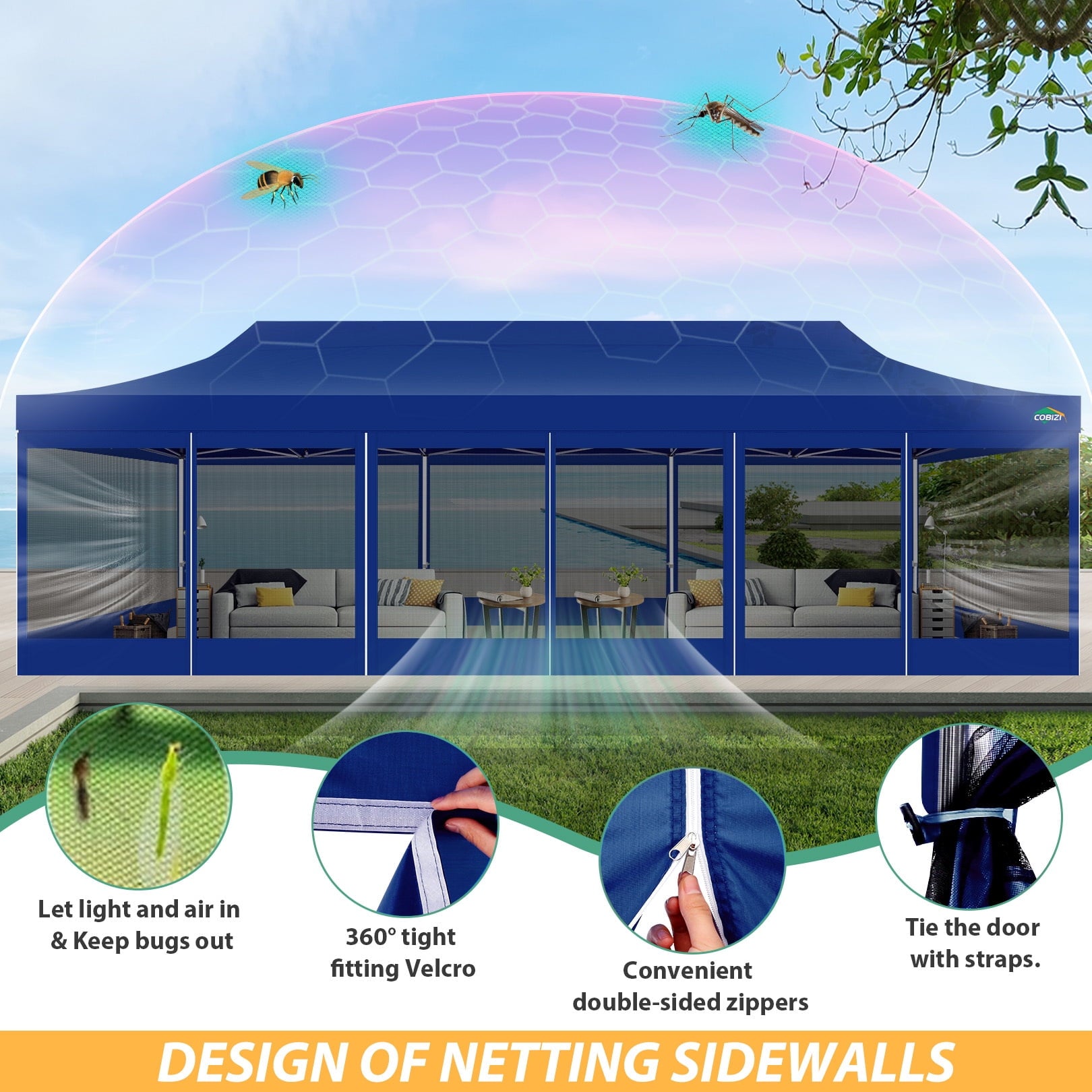 COBIZI 10X30 Heavy Duty Pop up Canopy with Mosquito Net is an expansive and versatile outdoor tent perfect for a range of events,from backyard gatherings to weddings,birthday parties,and camping.10x30 pop up Canopy Gazebo's robust construction ensures its longevity and suitability for various outdoor conditions.Heavy duty pop up canopy also boasts waterproof and anti-uv properties.The design includes mosquito mesh sidewalls design ensures ventilation while effectively preventing insect intrusion. Its pop-up design facilitates quick and convenient installation and disassembly for outside.