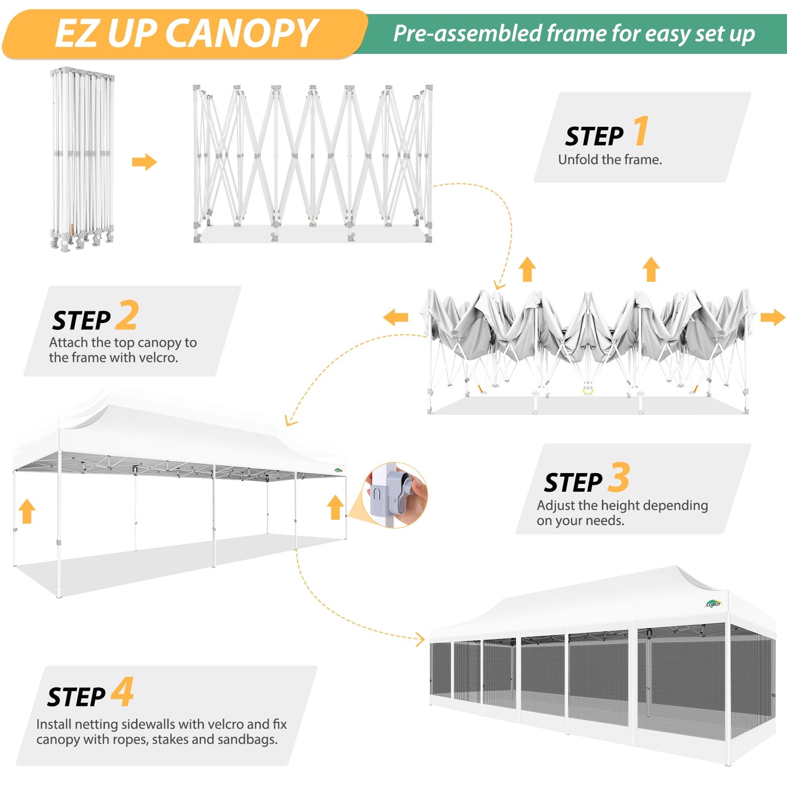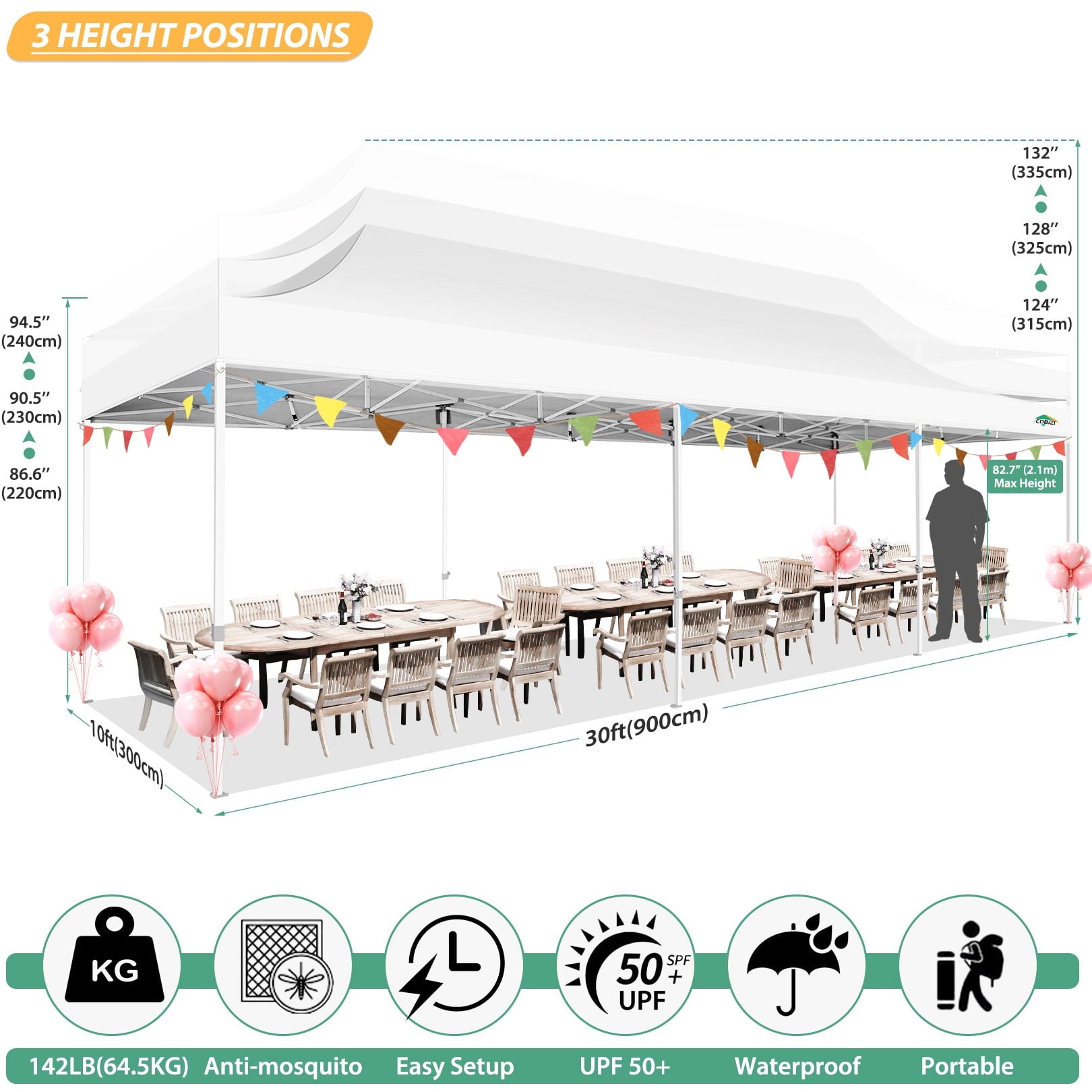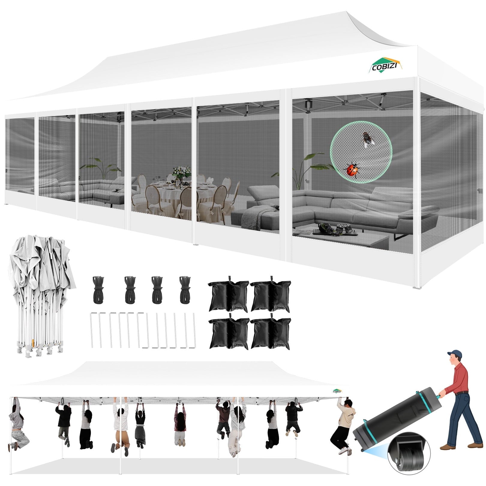 COBIZI 10X30 Heavy Duty Pop up Canopy with Mosquito Net is an expansive and versatile outdoor tent perfect for a range of events,from backyard gatherings to weddings,birthday parties,and camping.10x30 pop up Canopy Gazebo's robust construction ensures its longevity and suitability for various outdoor conditions.Heavy duty pop up canopy also boasts waterproof and anti-uv properties.The design includes mosquito mesh sidewalls design ensures ventilation while effectively preventing insect intrusion. Its pop-up design facilitates quick and convenient installation and disassembly for outside.