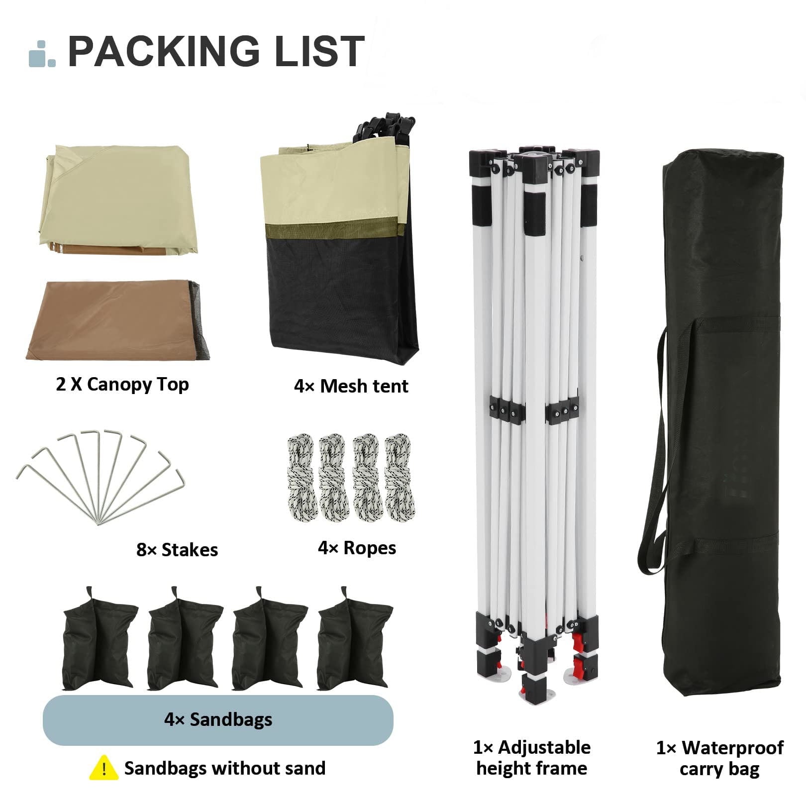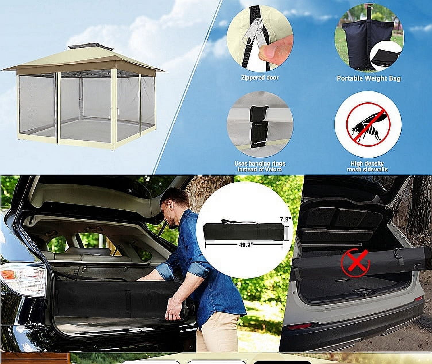 Durable pop-up Gazebo: Our gazebo frame is made of high-quality steel, coated with powder on the surface, which has rust resistance and durability, providing strong support for the entire pavilion. One click opening is very easy to assemble and disassemble, and one person can complete it in one minute. Not only suitable for gatherings, camping, or travel, but also for courtyards, backyards, and screening rooms. Garden gazebo canopy with 4 detachable mosquito nets: 4 movable zippered mosquito nets serve as a barrier against mosquitoes and other harmful insects. Enjoy fun outdoor activities effortlessly on a private terrace, while these mesh side walls provide ample airflow and visibility. Upgraded ventilation top and additional shading area: Keep cool with our new ventilation holes, designed to provide excellent airflow when you work or relax. The top drainage hole of the pavilion helps with drainage, and the waterproof strip can prevent water accumulation. In addition, this COBIZI gazebo is designed with additional sunshades, a 10'x10 'straight leg frame, and a 12'x12' top cover, covering an area of 144 square feet, which is sufficient to accommodate 10-12 people and some chairs. The wider edge at the top and waterproof sealing tape enhance waterproofing. Professional rain and UV protection: Our waterproof canopy tent is made of 210D Oxford cloth on the top, lined with silver plated PU, which has good waterproof and sun protection performance. UPF 50+UV protection helps block up to 99% of harmful UV rays. 3 adjustable heights and Compac package: Our COBIZI gazebo tent has 3 adjustable heights: 6.2 feet -6.6 feet -6.9 feet. You can adjust the appropriate height as needed by using the adjustment button. The size of the handbag is 49.2 "x7.9" x7.9 ", making it easy to carry and use in the car at any time. Components included: Our pavilion comes with complete accessories - fully assembled pop-up powder coated steel frame, 210D flame-retardant silver coated canopy top, 4 mosquito net walls, 600D heavy-duty inventory wear-resistant handbag, 8 wooden stakes, 4 ropes, and 4 sandbags. If you have any doubts about our products, we are always available to help you.Specifications: