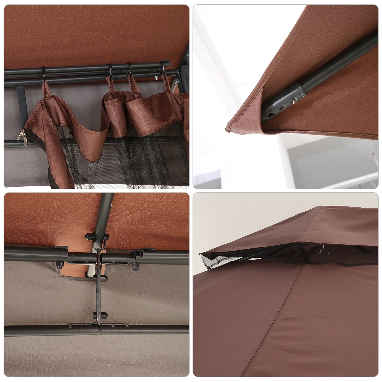 Our patio gazebo is designed with a double-vented roof to enhance air circulation and improve wind resistance. The mosquito net on the top roof helps keep insects out, and the drain hole at the top prevents water from accumulating and damaging the frame during rainy days.