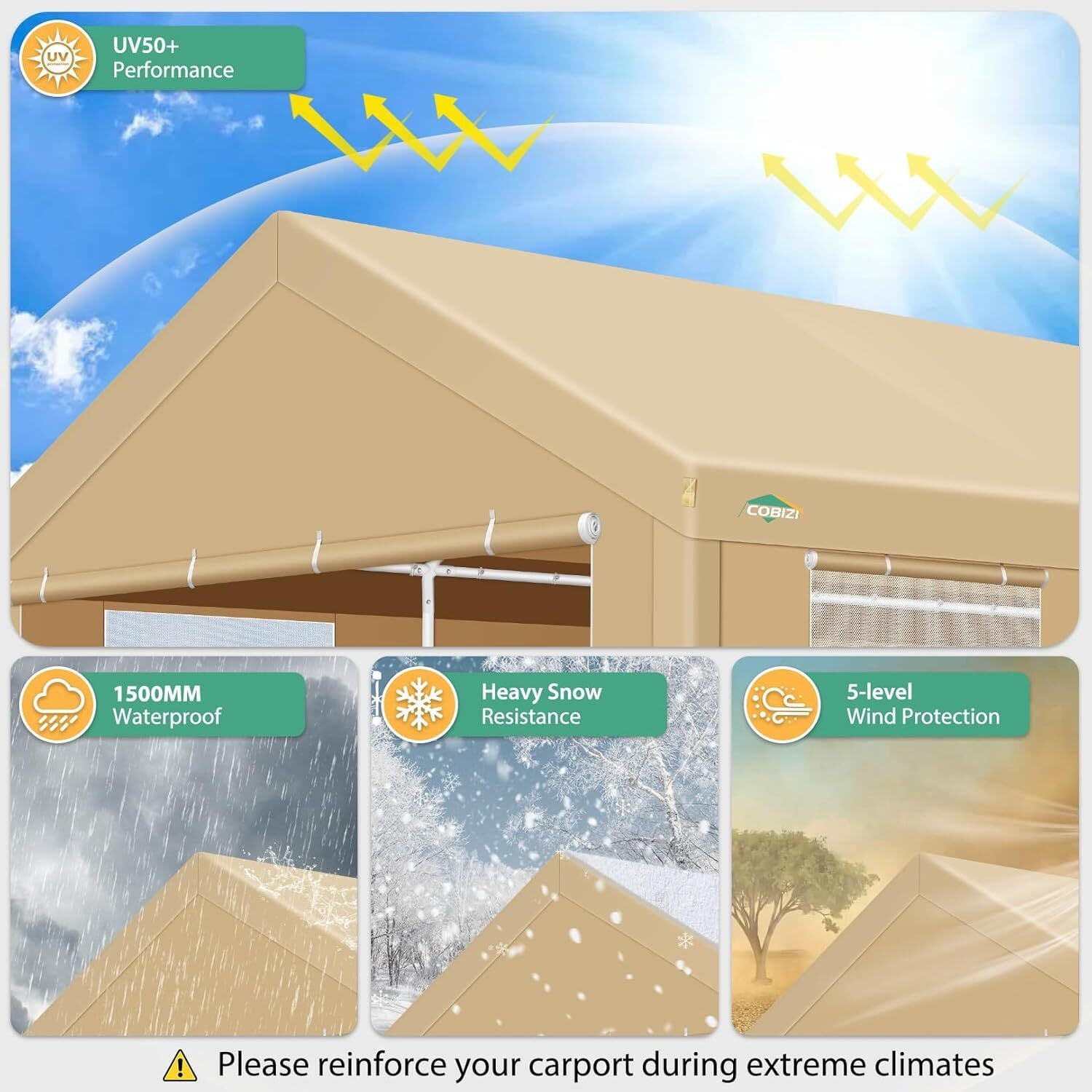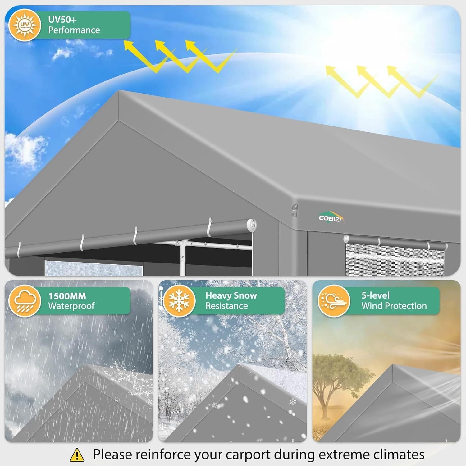 The tarp of our 12x20 carport, crafted from 160gPE material, offers excellent waterproof, ultraviolet-resistant, and tear-resistant properties. It is designed to provide year-round protection for your vehicles.