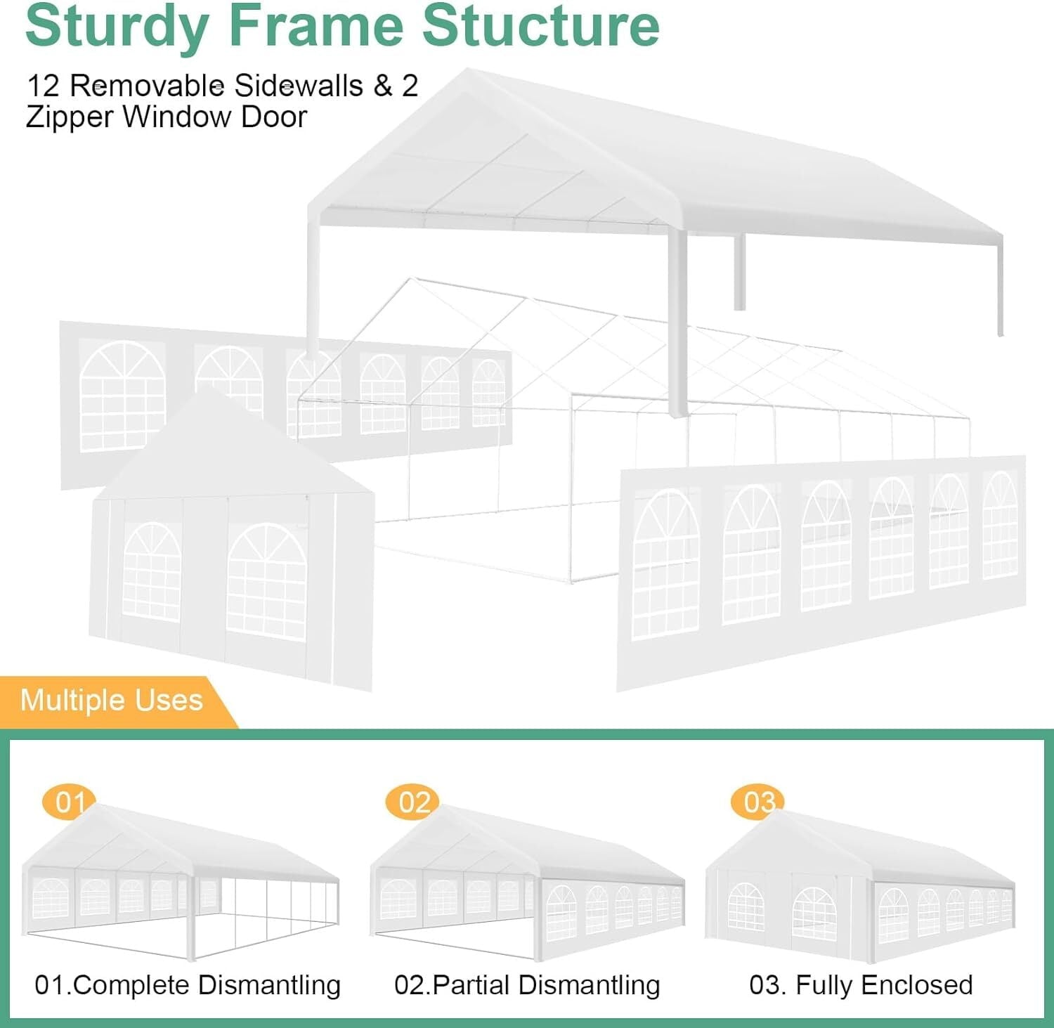 Premium Construction Material: The top cover of the Carport Canopy tent is made of 160g imported PE fabric, provide 100% waterproof and UV protection. Our 20x40 Heavy Duty Canopy Tent is designed with 6 removable sidewalls and 2 zippered doors with chapel-designed windows that provide excellent cross-ventilation and airflow, ensuring you stay cool and comfortable even on the hottest days. In addition, the removable sidewalls allow you to customise the amount of ventilation to your liking.