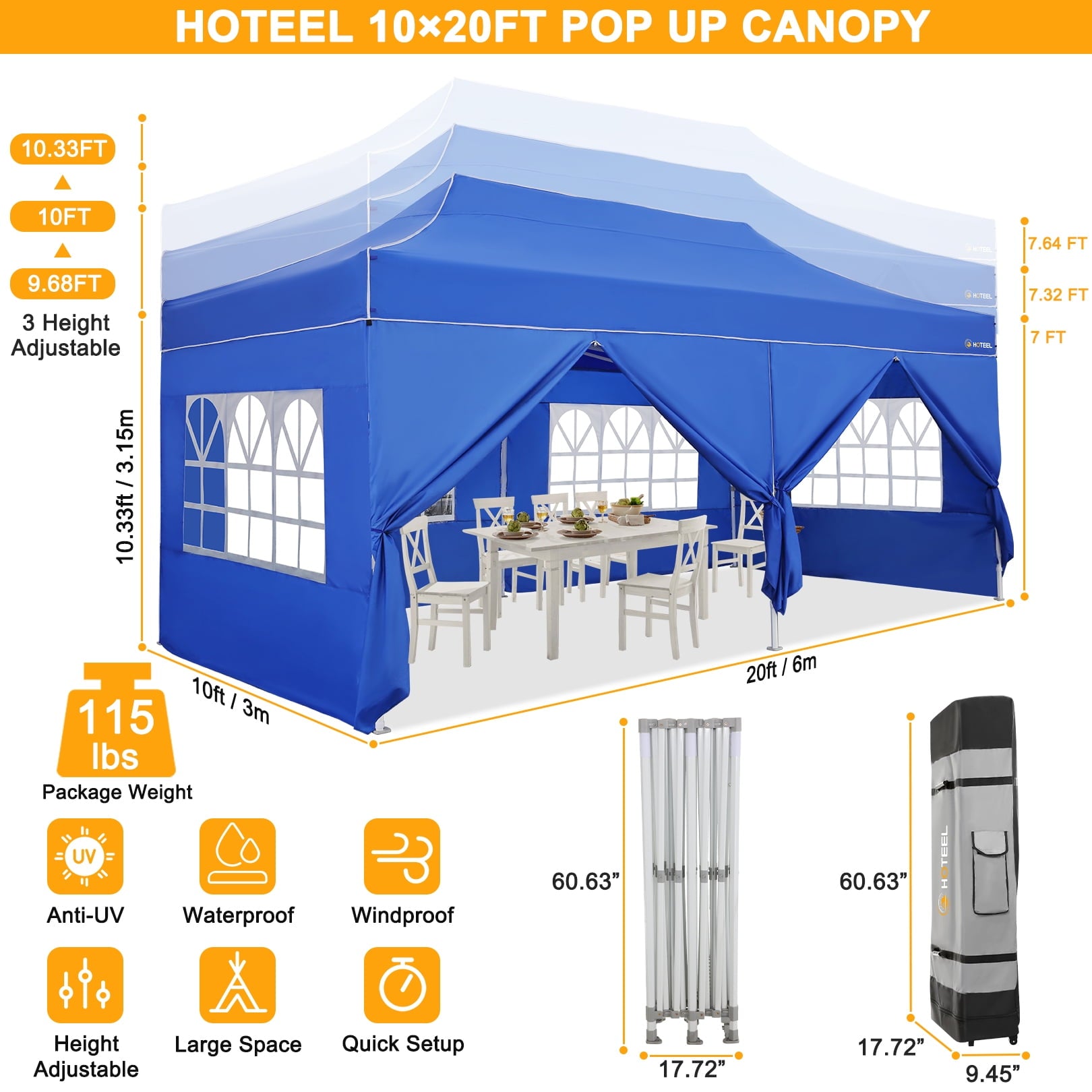 A 10x20 tent with canopy is simple to set up in minutes without tools, requiring only 2-3 people. The tent with pop-up sidewalls offers ample space for comfortably hosting between 15-20 people. Expect upgraded thumb buttons for adjusting tent heights to 3 different options (118\