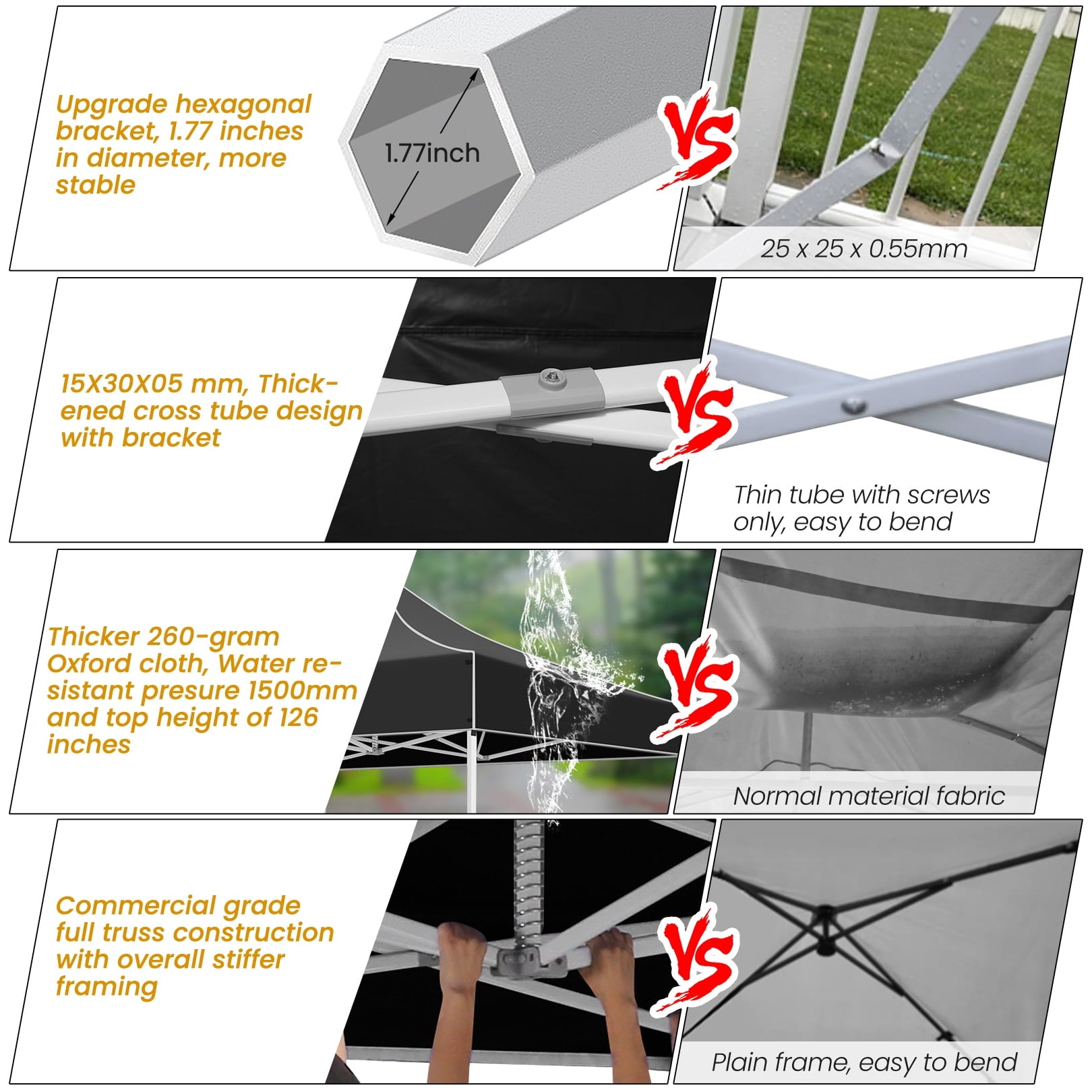 COBIZI 10x20 Heavy Duty Canopy Tent has a robust commercial grade frame, resistant to rust and long-lasting. The improved design features an upgraded spring bracket that securely tightens the top material and effectively reduces the risk of water accumulation. The hexagonal tubes have been reinforced and are now 40mm in diameter and 0.03''/0.7mm in wall thickness, considerably stronger than those of regular party tents which have a diameter of only 0.98'' and a wall thickness of 0.02''.
