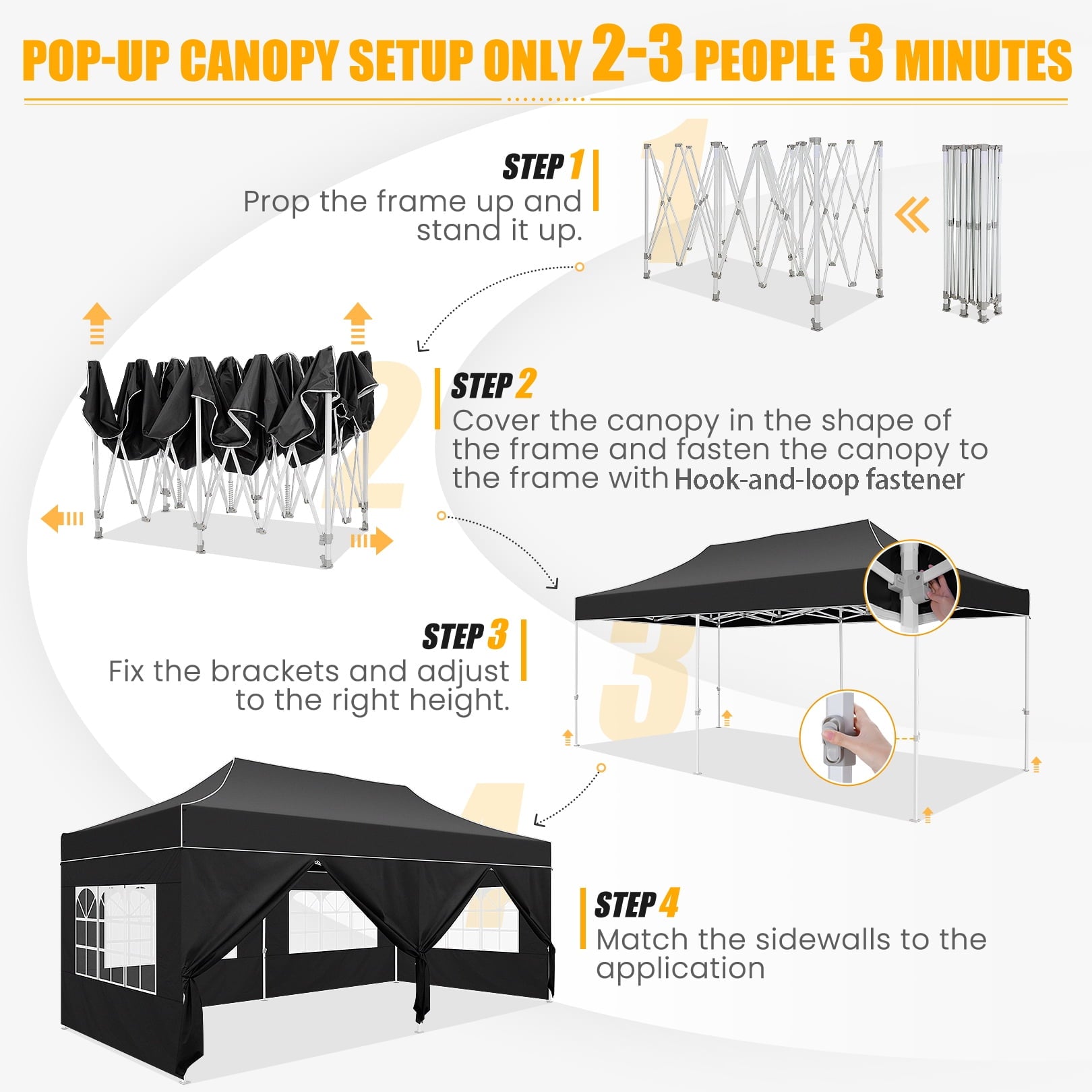 A 10x20 tent with canopy is simple to set up in minutes without tools, requiring only 2-3 people. The tent with pop-up sidewalls offers ample space for comfortably hosting between 15-20 people. Expect upgraded thumb buttons for adjusting tent heights to 3 different options (118\