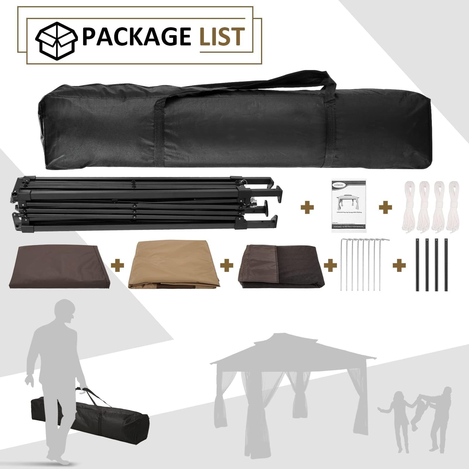 Install or close is efficient and hassle-free with HOTEEL 11x11 pop up gazebo. Take out the frame, after unfold the frame and cover the two tops, just install the netting sidewall fixing with Velcro. Adjust the height and use the ground nails and windproof ropes to fix the patio gazebo. (Not for lightning storm, rainstorm or snowing days using)