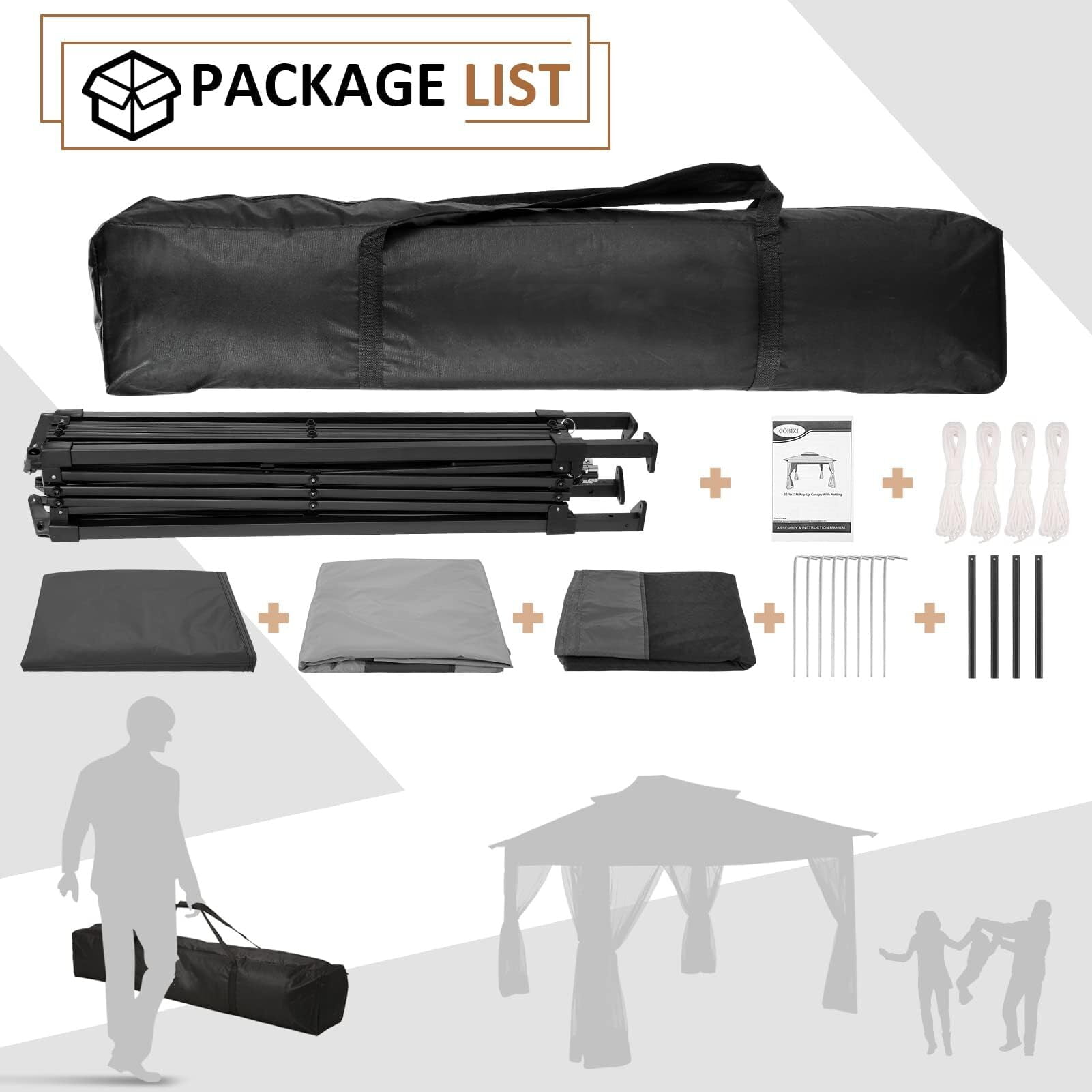 Install or close is efficient and hassle-free with HOTEEL 11x11 pop up gazebo. Take out the frame, after unfold the frame and cover the two tops, just install the netting sidewall fixing with Velcro. Adjust the height and use the ground nails and windproof ropes to fix the patio gazebo. (Not for lightning storm, rainstorm or snowing days using)