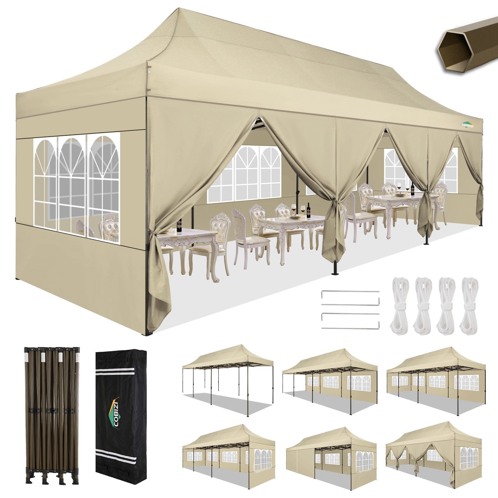 COBIZI Heavy Duty 10x30 Party Tent,Commercial pop up Canopy for Parties,Waterproof Gazebos, 8 Sidewalls,Waterproof UPF50+,Stable Thickened Frame,Khaki