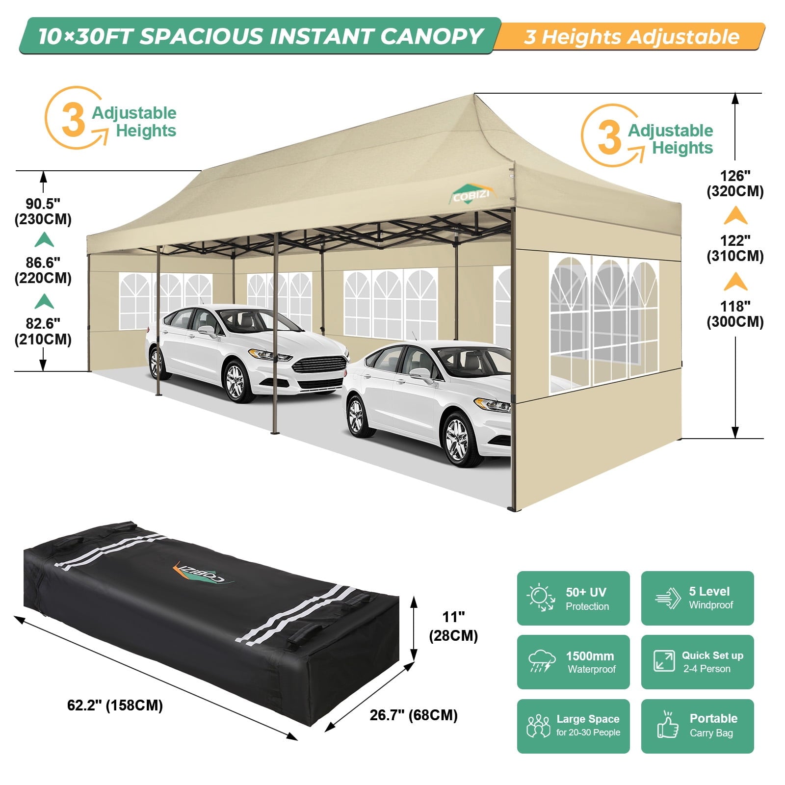 COBIZI Heavy Duty 10x30 Party Tent,Commercial pop up Canopy for Parties,Waterproof Gazebos, 8 Sidewalls,Waterproof UPF50+,Khaki