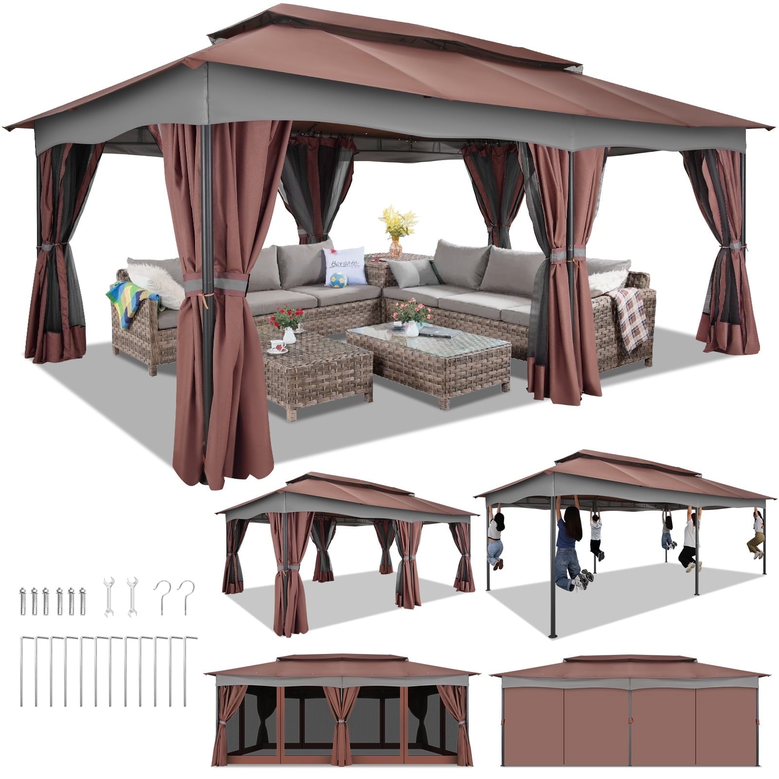Hoteel Outdoor Gazebo 12x20 Patio Gazebo with Netting and Curtains Waterproof Gazebo with Double Roof Large Backyard Gazebo with Metal Steel Frame for Backyard, Lawn, Party, Garden, Brown