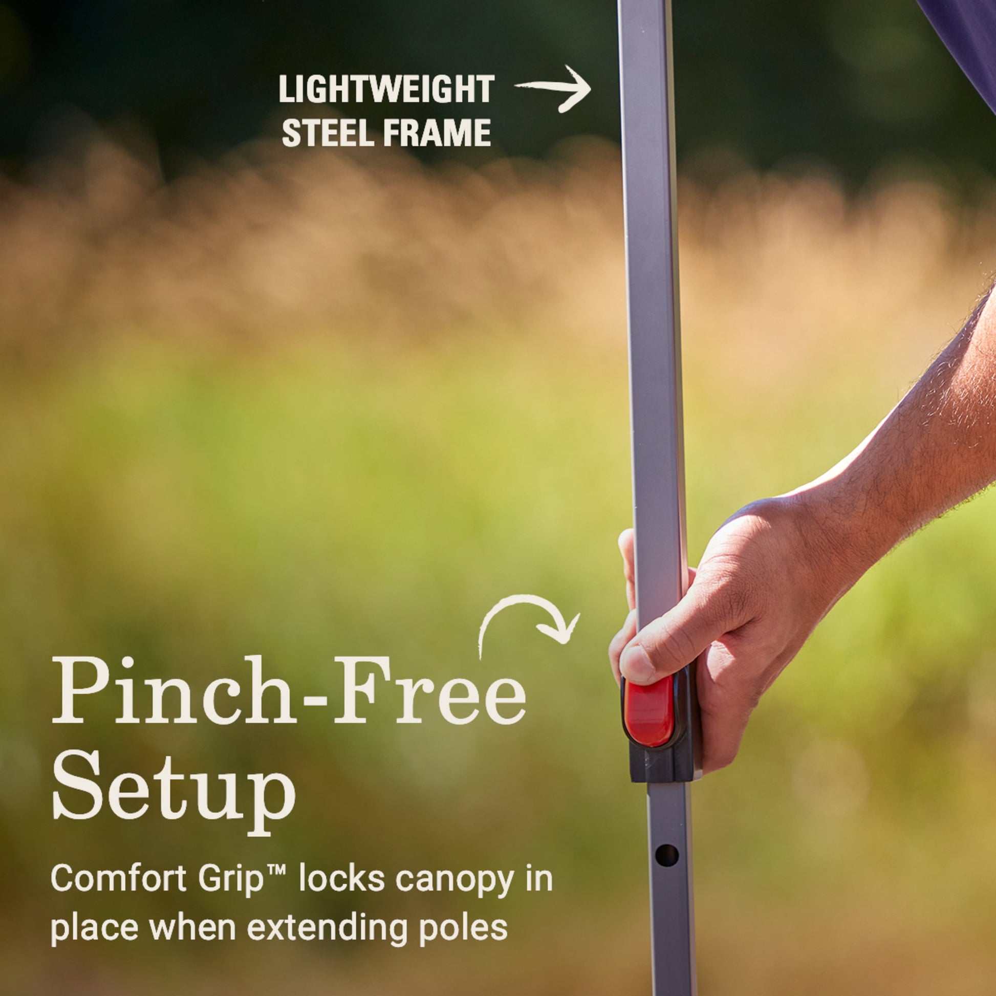 - Comfort Grip? features pinch-free buttons that lock the poles in place for easy setup and takedown