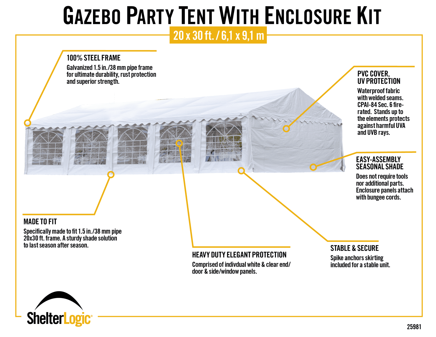 ShelterLogic® Party Tent are a decorative and affordable solution for hosting any outdoor event or festival. Host the reception cocktail hour or let the DJ spin the music and get everyone dancing while protected from the weather. With versatile options and colors to choose from, these canopies go beyond the backyard to farm or roadside stands, maris, or anywhere shade and protection are required. Why rent a tent for just one day when you can own a ShelterLogic Party Tent for less than the cost of a rental?