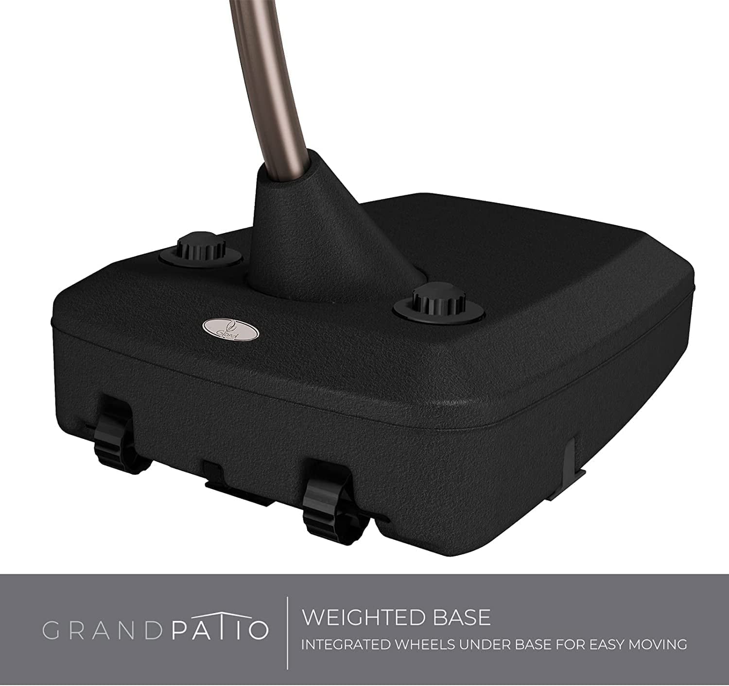 - STABILITY BASE WITH WHEELS: The outside umbrella has wheels for easy movement, in order to safely secure your umbrella, the base must be filled with 330 lbs sand and 44 lbs water, 374 lbs in total. Because of the risks of bad weather, it is best to close your umbrella into the deadlock position when you are not using it.